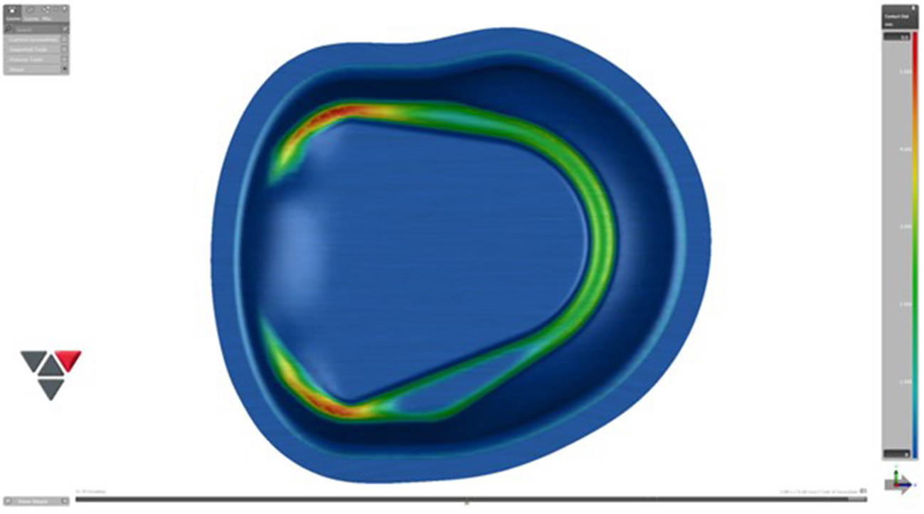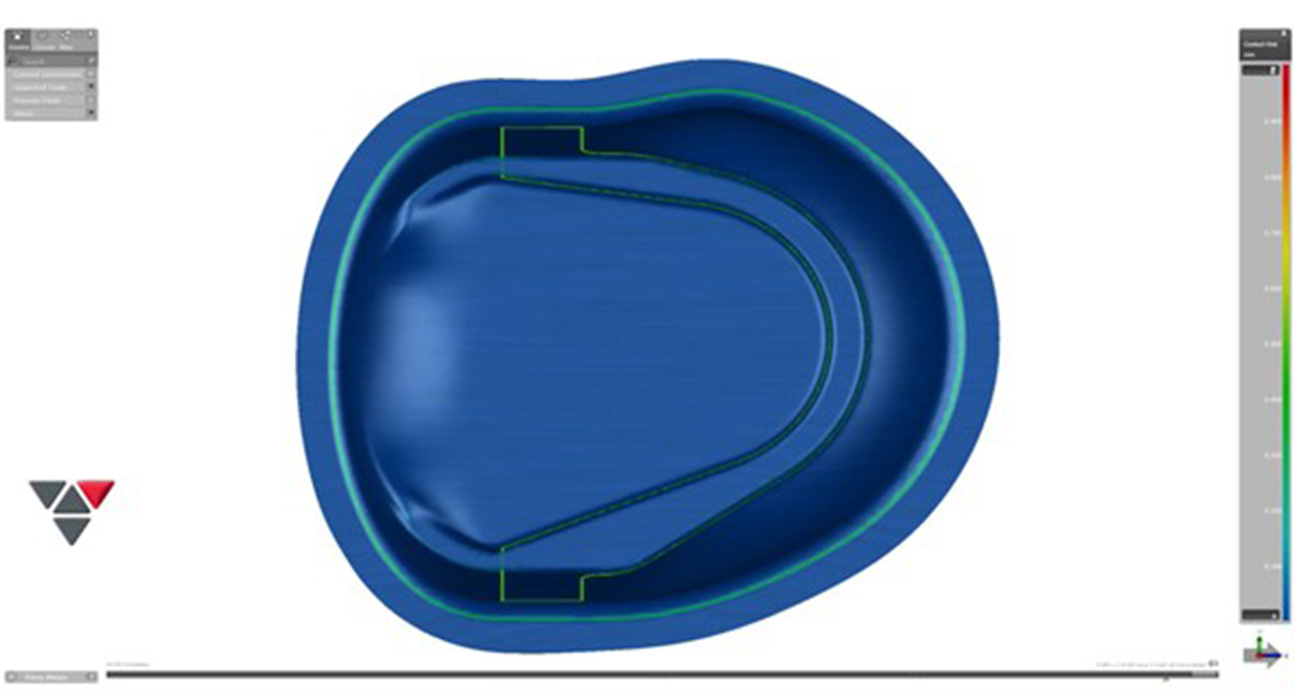 Fig. 2: The final simulation of the re-engineered part produced collaboratively by the defense contractor and FluidForming Americas for the U.S. Air Force (contact distance)